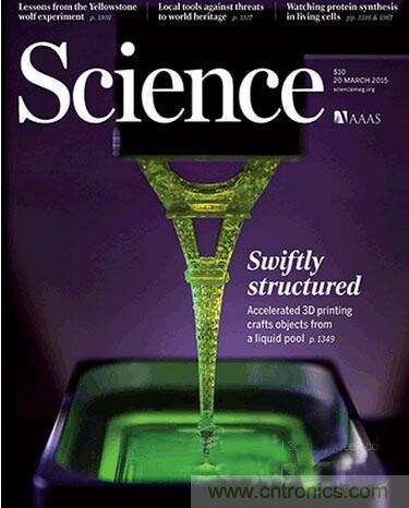 這些神奇的動(dòng)圖都出自最近發(fā)表在《科學(xué)》(Science)上的一篇有關(guān)3D打印技術(shù)的研究論文。這種新技術(shù)顯然也征服了期刊的編輯,在期刊封面上都出現(xiàn)了這個(gè)從液體中打印出來(lái)的“倒立鐵塔”的身影。那么,這種液體3D打印技術(shù)究竟有什么過(guò)人之處?球和塔又是怎么從液體里“拉”出來(lái)的呢?