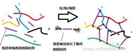 在圖中,小a、小b、小c等等是一群活潑的聚合物分子,因?yàn)檫@些鏈狀的分子之間很容易相互移動(dòng),所以看上去是一灘黏黏的液體(有時(shí)候可能粘度很大,比如硫化前的天然橡膠,它從樹上滴下來(lái)的速度非常緩慢)。有一天惡魔把一把單純善良的固化劑混進(jìn)了小兄弟里面,小兄弟活潑依舊,絲毫沒(méi)有發(fā)現(xiàn)危險(xiǎn)的存在。突然有一天惡魔把這灘小兄弟連固化劑一起放進(jìn)了高溫高壓的一個(gè)東西里面(一般稱為硫化機(jī)/熱壓機(jī)),然后看似無(wú)害的固化劑長(zhǎng)出了魔爪,死死抓住了小兄弟們,一個(gè)又一個(gè)的魔爪分別抓住不同的兄弟們,產(chǎn)生了很多交聯(lián)結(jié)構(gòu),即使沒(méi)有了高溫高壓也不會(huì)再放開。最后小兄弟們?cè)僖膊荒茈S便活動(dòng)了,這灘液體也變成了硬硬的一塊——這就是固化過(guò)程的通(dou)俗(bi)解釋。當(dāng)然也有些固化劑的固化原理是引發(fā)小分子聚合物上的基團(tuán)相互反應(yīng)的,這種一般被稱為引發(fā)劑。