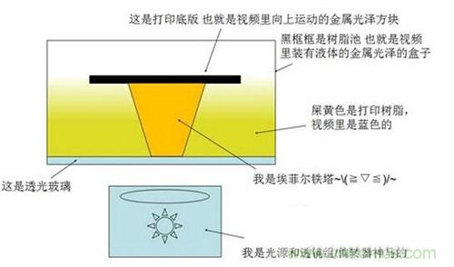 簡(jiǎn)單來(lái)說(shuō),立體光固化的過(guò)程就是光照射光敏樹脂表面,使其固化成薄薄的一層固體,已經(jīng)固化完成的部分被一塊基板黏附著,逐漸與光照射面拉開一定距離(通常是每次移動(dòng)十幾個(gè)微米),然后在上一層固化樹脂的基礎(chǔ)上再進(jìn)行下一層的照射和固化。經(jīng)過(guò)層層固化疊加之后,最終就形成一個(gè)完整的立體結(jié)構(gòu)。下面這張圖表示的就是SLA設(shè)備的基本結(jié)構(gòu),固化反應(yīng)發(fā)生在打印樹脂與透光玻璃板的交界面上,由于光照射面在液面的下方,打印的過(guò)程看上去就像從液體里“拉”出了打印制件一樣。
