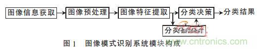 圖像識別技術(shù)是利用計算機(jī)視覺采集物理對象,以圖像數(shù)據(jù)為基礎(chǔ),讓機(jī)器模仿人類視覺,自動完成某些信息的處理功能,達(dá)到人類所具有的對視覺采集圖像進(jìn)行識別的能力,以代替人去完成圖像分類及識別的任務(wù)。圖像模式識別系統(tǒng)通常由五個模塊組成,如圖1所示。