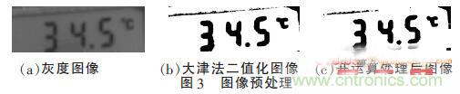 由上圖2所示,得到的圖像是彩色圖像,由于光照強(qiáng)度等原因,液晶屏圖像中常有許多噪聲點(diǎn)。為了得到精確圖像,本文對圖像進(jìn)行灰度化處理、大津法二值化處理和開運(yùn)算處理。下圖3中(a)、(b)和(c)分別為灰度化處理、大津法二值化處理和開運(yùn)算處理后的結(jié)果。