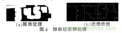 對于液晶屏圖像,考慮采用霍夫變換的方法求其傾斜角。通過霍夫變換,可以取得圖像中所有直線的端點(diǎn)。為了便于快速、高效地求取圖像的傾斜角,先對圖像進(jìn)行膨脹處理和邊緣檢測。