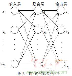 三層BP神經(jīng)網(wǎng)絡(luò)的模型如圖8所示,包括輸入層、隱含層和輸出層,各層間由連接權(quán)值構(gòu)成。BP神經(jīng)網(wǎng)絡(luò)的訓(xùn)練過程由信號的正向傳播和誤差的反向傳播兩個過程組成,其學(xué)習(xí)的本質(zhì)是各連接權(quán)值的動態(tài)調(diào)整。隨著網(wǎng)絡(luò)的不斷學(xué)習(xí),權(quán)值也不斷的調(diào)整,直到誤差減少到可接受的程度或者訓(xùn)練達(dá)到預(yù)定的訓(xùn)練次數(shù)。