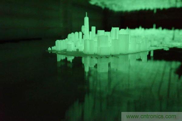 這些城市街區(qū)是用3ds Max和Rhino軟件設(shè)計(jì)之后,再用能夠在黑暗中發(fā)光的半透明線材3D打印的。這其中的每個模型都經(jīng)過了精心設(shè)計(jì)使之盡可能地與真實(shí)保持一致。除此之外,Huang還會偶爾在個別細(xì)部的地方秀一下自己的幽默感,比如他就3D打印了一個金剛并將其放到了自由塔上。
