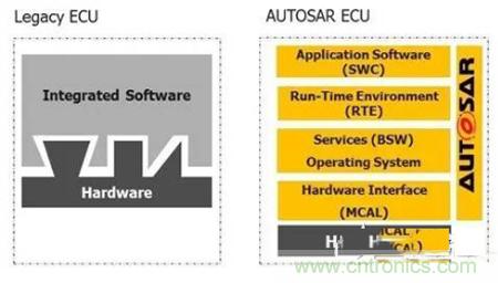 就本質(zhì)而言,AUTOSAR提供標(biāo)準(zhǔn)的ECU接口定義,使設(shè)計人員能夠具體指定每個汽車ECU中都需要的可重復(fù)使用之標(biāo)準(zhǔn)化軟件層和組件。該標(biāo)準(zhǔn)不受硬件的影響,這意味著應(yīng)用軟件和硬件平臺是相互獨立的。應(yīng)用軟件開發(fā)人員可在應(yīng)用軟件中明確地說明各個汽車功能的細節(jié),而不用擔(dān)心相關(guān)軟件服務(wù)和硬件接口。過去,軟件和硬件緊密地整合在一起,因此很難實現(xiàn)可移植性和可重復(fù)使用(圖1)。