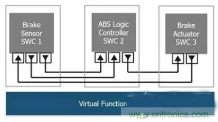 將設(shè)計與硬件決策分開使車輛生產(chǎn)商/OEM能夠依據(jù)所需的車輛功能進行自上而下的設(shè)計。存在于這個設(shè)計時間的虛擬功能總線(VFB)概念讓所有軟件電子控制單元都能夠?qū)崿F(xiàn)互連和獲得測試。這讓設(shè)計人員可專注于應(yīng)用層,而不是根本的軟件基礎(chǔ)建設(shè)。通過采用虛擬功能總線,應(yīng)用軟件組件(SWC)與其它應(yīng)用軟件組件也相互獨立。軟件組件向虛擬功能總線發(fā)出輸出信號,虛擬功能總線再將信息傳送給目標(biāo)組件的輸入埠。AUTOSAR定義了輸入和輸出端口,以及交換信息的格式。這種抽離式的(abstracted)方法使得在定義相關(guān)硬件之前可實現(xiàn)所有車輛軟件功能和接口交互驗證。設(shè)計調(diào)整也因此變得容易得多,同時所有功能都被定義成虛擬功能總線上的軟件組件(圖2)。