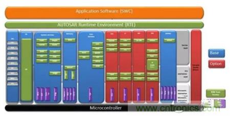 AUTOSAR分層軟件架構(gòu)可以分離硬件的應(yīng)用邏輯(application logic),以便重復(fù)利用和可以攜帶(portability)。運行環(huán)境和操作系統(tǒng)與微控制器抽象層(MCAL)相連,MCAL提供了對主微控制器上物理埠和設(shè)備的存取功能。微控制器抽象層是每一微控制器所特有的,使操作系統(tǒng)和基礎(chǔ)軟件能夠存取數(shù)字輸入/輸出、模擬數(shù)字轉(zhuǎn)換、FLASH和EEPROM支持等設(shè)備。圖4說明了AUTOSAR電子控制單元中不同硬件和軟件層之間的關(guān)系。
