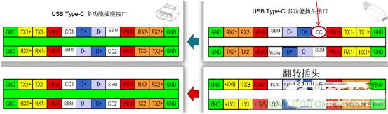 可以看出,USB Type-C采用了對(duì)稱(chēng)的方式,因此翻轉(zhuǎn)后并不影響接口的布局。電源和地都有4個(gè),這樣便可支持USB PD大功率模式。CC1和CC2是兩個(gè)關(guān)鍵引腳,其作用有如下幾點(diǎn):探測(cè)連接,區(qū)分正反面,區(qū)分DFP和UFP;配置 Vbus,有USB Type-C和USB PD兩種模式;配置Vconn,當(dāng)線纜里有芯片的時(shí)候,一個(gè)cc傳輸信號(hào),一個(gè)CC變成供電Vconn;配置其他模式,如Displayport等。