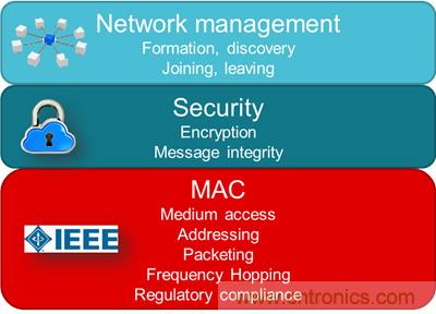 IEEE 802.15.4標(biāo)準(zhǔn)被用作目前市面上很多常見(jiàn)網(wǎng)絡(luò)互連標(biāo)準(zhǔn)的數(shù)據(jù)鏈路層,例如6LoWPAN、Wi-SUN、ZigBee®、Thread和WHART等。由于諸如空中調(diào)停(通過(guò)CSMA-CA實(shí)現(xiàn))、接受、重傳以及內(nèi)置AES安全性等特性,其保障了無(wú)線基礎(chǔ)的穩(wěn)定。