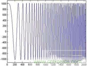 根據(jù)上面的程序,取調(diào)頻斜率為400,頻率控制字為10,幅度量化為10位(和所使用的D/A配合),相位累加器為24位,用Matlab仿真得到的線性調(diào)頻信號(hào)的波形和相應(yīng)的幅頻響應(yīng)如圖3和圖4所示。