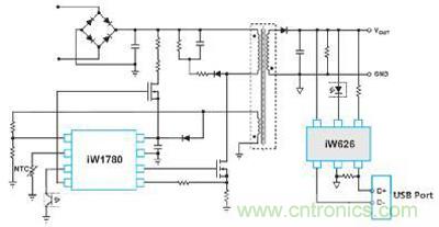 典型的手機充電器的硬件結構(以基于Dialog方案的高通QC2.0快充協(xié)議為例)如圖 1所示。iW626作為QC2.0協(xié)議控制器,經由USB口的D+/D-信號和手機側AP進行供電協(xié)商,然后通過光耦控制原邊的AC/DC控制器iW1780完成輸出電壓的調整。
