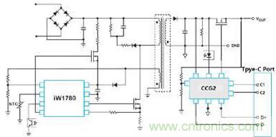 基于PD協(xié)議的充電器電路可以維持AC/DC部分不變,只是將QC協(xié)議控制器替換為PD控制器[1],比如Cypress半導體的CCG2(Type-C Controller Generation 2). CCG2 是最早通過USB-IF認證的PD控制器之一,內部包含ARM® Cortex®-M0處理器和完備的PD協(xié)議收發(fā)器,可以滿足充電器,主機,附件,EMAC線纜等各種支持Type-C口的應用,在蘋果,聯(lián)想,HP,Dell,小米,樂視等一線品牌客戶都有眾多的量產案例。
