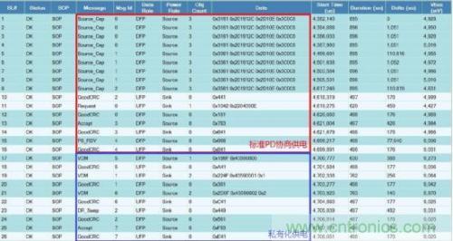為了更加有效開發(fā)和準確驗證基于控制流程的協(xié)議溝通,本文采用賽普拉斯研發(fā)的PD協(xié)議分析儀CY4500 EZ-PD™ Protocol Analyzer。CY4500 協(xié)議分析儀通過抓取配置通道(CC,Configuration Channel)上的數(shù)據(jù)包,并通過USB接口發(fā)送到主機端,通過軟件EZ-PD Analyzer Utility解碼并顯示PD協(xié)議包。CY4500不僅可以實時顯示并解析PD通信包,而且還實時測量電力傳輸過程中的電壓和電流值,進而縮短了開發(fā)周期,對于調試以及兼容性測試幫助非常大。