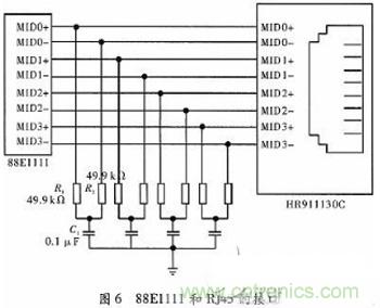 88E1111和網(wǎng)絡(luò)介質(zhì)之間無(wú)法直接連接,因傳輸速度在千兆級(jí),所以更加需要設(shè)計(jì)合適的網(wǎng)絡(luò)隔離變壓器來(lái)降低傳輸損耗、回音和串?dāng)_。本文選擇千兆網(wǎng)口插座HR911130C,該插座內(nèi)部自帶變壓器電路,只需在外部連接濾波網(wǎng)絡(luò)便可實(shí)現(xiàn)網(wǎng)絡(luò)信號(hào)穩(wěn)定地傳輸,如圖6所示。88E1111和 HR9111130C采用差分連接,在PCB布線時(shí)需要嚴(yán)格等長(zhǎng),且一般還需使用阻抗匹配網(wǎng)絡(luò),如圖6中的R1和C1。