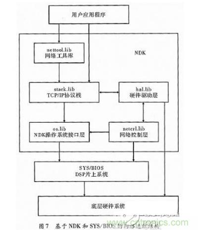 TI針對(duì)網(wǎng)絡(luò)開發(fā)發(fā)布了網(wǎng)絡(luò)開發(fā)套件(Network Development Kit,NDK),能將多個(gè)模塊的配置操作交給NDK網(wǎng)絡(luò)框架實(shí)現(xiàn),同時(shí)數(shù)據(jù)分包和解析也無(wú)需程序員過(guò)多考慮,加速了網(wǎng)絡(luò)開發(fā)進(jìn)程。NDK構(gòu)建在實(shí)時(shí)操作系統(tǒng)SYS/BIOS之上,NDK通過(guò)OS抽象層與BIOS進(jìn)行交互,同時(shí)BIOS的cfg配置文件能對(duì)NDK各模塊進(jìn)行可視化查看。