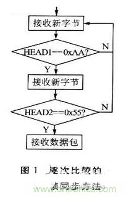 首先等待串口數(shù)據(jù),將接收到的第1個字節(jié)數(shù)據(jù)與約定好的包頭信息的第1個字節(jié)進(jìn)行比較。如果不正確,則等待新字節(jié),直到接收的數(shù)據(jù)與包頭信息的第1個字節(jié)相同。第1個字節(jié)比較正確以后,將收到的第2個字節(jié)與包頭信息的第2個字節(jié)進(jìn)行比較。如果仍然正確,則說明串口接收已經(jīng)同步,可以開始接收數(shù)據(jù)幀中的數(shù)據(jù)部分;否則,重新開始同步過程。其程序流程如圖1所示。
