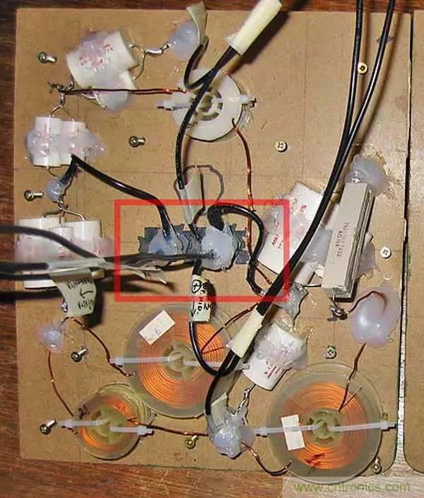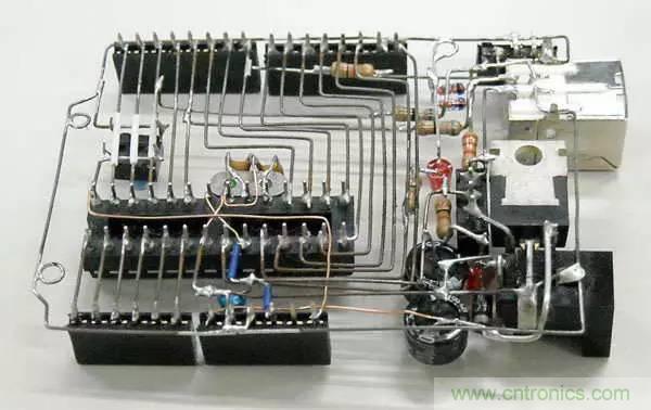 對于元器件在萬能板上的布局,大多數人習慣“順藤摸瓜”,就是以芯片等關鍵器件為中心,其他元器件見縫插針的方法。這種方法是邊焊接邊規(guī)劃,無序中體現著有序,效率較高。但由于初學者缺乏經驗,搭出來的板是這樣的……