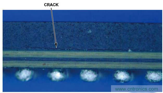 圖3. 過度加熱導致PBGA上出現(xiàn)裂紋的低放大率圖像(側視圖)