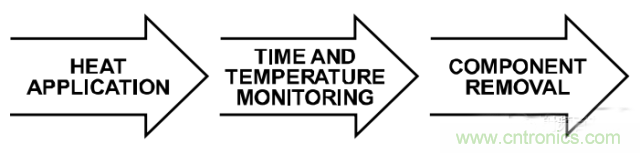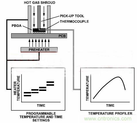 可使用不同的工具來移除器件。為了移除器件,可能要加熱器件,直至焊料回流,然后在焊料仍處于液態(tài)時通過機械手段移除器件。可編程熱空氣返修系統(tǒng)可提供受控溫度和時間設置。