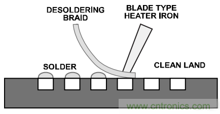 去錫。利用吸錫線和刀片型烙鐵去除焊盤上過多的焊料(參見圖6)。所選刀片的寬度應與器件占用的最大寬度相匹配。刀片溫度必須足夠低,以避免損壞電路板??蓪⒑竸┩吭诤副P上,然后用吸錫線和烙鐵去除過多焊料。