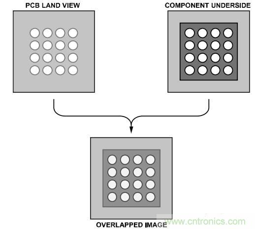將器件精準貼放到電路板上是很重要的。帶分光束光學系統(tǒng)的貼片設備有助于PBGA和電路板的對齊。此類成像系統(tǒng)涉及到將PBGA焊球鏡像疊放在PCB焊盤鏡像上(參見圖10)。貼片機必須具有支持用戶沿x軸和y軸進行微調(包括旋轉)的能力。