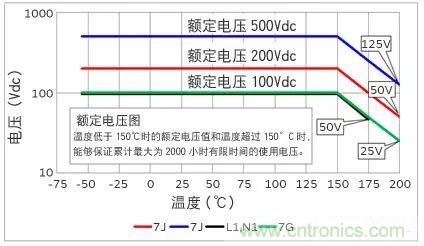 產(chǎn)品溫度超過(guò)150℃時(shí),請(qǐng)按照下面的額定電壓降低施加在電容器上的電壓再使用。