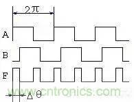 從表1可知,如果輸入端A和B分別送入占空比為50%的信號波形, 則當(dāng)兩者存在相位差Dθ時,輸出端F的波形的占空比與Δθ有關(guān),見圖3。將F輸出波形通過積分器平滑,則積分器輸出波形的平均值,它同樣與Δθ有關(guān),這樣,我們就可以利用異或門來進行相位到電壓的轉(zhuǎn)換,構(gòu)成相位檢出電路。于是經(jīng)積分器積分后的平均值(直流分量)為:U = Vdd * Δ θ/π (1)