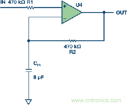 所有運(yùn)算放大器都有一定的輸入電容,包括差分和共模。如果運(yùn)算放大器連接為跟隨器,并且在反饋路徑中放入一個(gè)電阻以平衡阻抗,那么系統(tǒng)可能容易發(fā)生振蕩。原因是:大反饋電阻、運(yùn)算放大器的輸入電容和PC板上的雜散電容會(huì)形成一個(gè)RC低通濾波器(LPF)。此濾波器會(huì)引起相移,并降低閉環(huán)系統(tǒng)的相位裕量。如果降低得太多,運(yùn)算放大器就會(huì)振蕩。一位客戶在一個(gè)1 Hz Sallen-Key低通濾波器電路中使用AD8628 CMOS運(yùn)算放大器。由于轉(zhuǎn)折頻率較低,電阻和電容相當(dāng)大(參見圖3)。輸入電阻為470 kΩ,所以客戶在反饋路徑中放入一個(gè)470 kΩ電阻。此電阻與8 pF的輸入電容(參見圖4)一起提供一個(gè)42 kHz極點(diǎn)。AD8628的增益帶寬積為2 MHz,因此它在42 kHz仍有大量增益,它發(fā)生了軌到軌振蕩。把470 kΩ電阻換成0 Ω跳線即解決了問題。因此,反饋路徑中應(yīng)避免使用大電阻。這里,何者為大取決于運(yùn)算放大器的增益帶寬。對(duì)于高頻運(yùn)算放大器,例如增益帶寬超過400 MHz的ADA4817-1,1 kΩ反饋電阻就稱得上是大電阻。務(wù)必閱讀數(shù)據(jù)手冊(cè)以了解其中的建議。