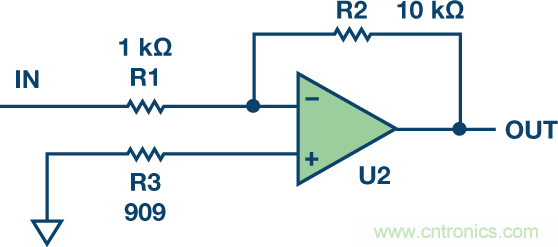 電阻熱噪聲的計(jì)算公式為√4kTRB,故1 kΩ電阻會(huì)有4 nV/√Hz的噪聲。增加電阻會(huì)增加噪聲。在圖2中,出人意料的是,雖然909 Ω補(bǔ)償電阻是值最低的電阻,但由于從該節(jié)點(diǎn)到輸出端的噪聲增益,它給圖2輸出端貢獻(xiàn)的噪聲最多。R1引起的輸出噪聲為40 nV/√Hz,R2為12.6 nV/√Hz,R3為42 nV/√Hz。因此,請(qǐng)勿使用電阻。另一方面,如果運(yùn)算放大器采用雙電源供電,并且一個(gè)電源先于另一個(gè)電源上電,那么ESD網(wǎng)絡(luò)可能發(fā)生閂鎖問題。這種情況下,可能希望增加一定的電阻來保護(hù)器件。但若使用的話,應(yīng)在電阻上放置一個(gè)旁路電容以減少電阻的噪聲貢獻(xiàn)。
