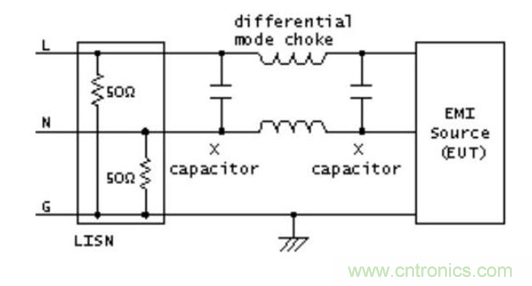 電容的作用是將高頻干擾電壓“短路”,另外,當(dāng)干擾信號(hào)頻率很高時(shí),抑制線圈將產(chǎn)生很大的交流阻抗。圖2顯示了兩種濾波類型的結(jié)構(gòu),其中,LISN是用于測量目的的線性阻抗穩(wěn)定網(wǎng)絡(luò)。如果是共模問題引起的干擾,X類型電容基本上沒有作用,因?yàn)閮删€上的干擾電壓是一樣的。因此,了解干擾類型對于選擇合理的電路結(jié)構(gòu)將起重要作用,并為解決問題提供技術(shù)依據(jù)。