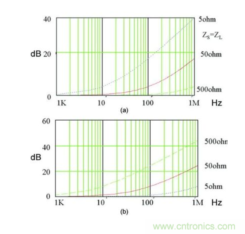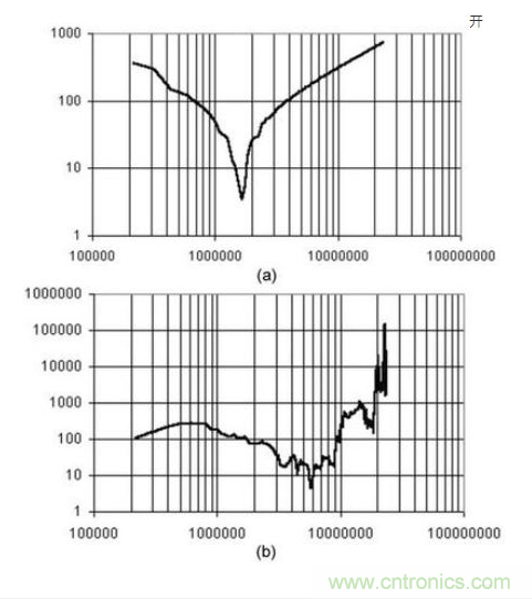 上面的例子說明,選擇一個(gè)具有很高插損的濾波器也不能很好抑制傳導(dǎo)噪聲的原因是,電源輸入端阻抗的影響。因此,設(shè)計(jì)者除了選擇一個(gè)合適的濾波器之外,還需要了解電源的阻抗特性、共模阻抗和差模阻抗。阻抗測試可以借助專用的阻抗測試儀或者傳導(dǎo)分析儀。一種濾波器的共模阻抗(a)和差模阻抗(b)的變化如圖5所示。