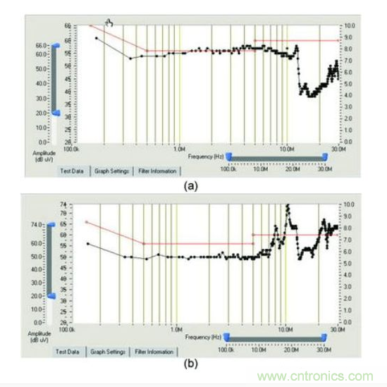 在標(biāo)準(zhǔn)電磁兼容性測試實(shí)驗(yàn)室可得到設(shè)備的總干擾情況,但無法了解設(shè)備的共模干擾和差模干擾特性。為了在測量中分辨共模或者差模干擾信號(hào),通用的儀器是很難實(shí)現(xiàn)的。使用專用的傳導(dǎo)測試儀,可獲得設(shè)備的總干擾、共模干擾和差模干擾。測試結(jié)果如圖3所示。