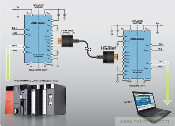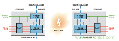 要提供隔離式 RS-232 通信接口,兩端的器件必須與所連的RS-232 電纜相互隔離。要隔離數(shù)據(jù)鏈路,則必須對(duì)數(shù)據(jù)信號(hào)線路和用于驅(qū)動(dòng)該電纜的電源進(jìn)行隔離。來(lái)自診斷端口上UART 的數(shù)據(jù)需要跨越隔離柵并傳輸至隔離總線側(cè)上的RS-232 收發(fā)器。本地 5 V/3.3 V 電源也需要跨越隔離柵來(lái)為隔離總線側(cè)上的 RS-232 收發(fā)器供電。工業(yè) PC 端也同樣需要如此:數(shù)據(jù)和電源均需要跨越隔離柵(圖 3).通過(guò)將器件與 RS-232 電纜網(wǎng)絡(luò)隔離開來(lái),診斷端口和工業(yè) PC電路均受到保護(hù),不受惡劣環(huán)境下可能耦合到 RS-232 電纜上的瞬變影響。隔離還可以中斷因診斷端口和工業(yè) PC 端存在不同接地電位而可能出現(xiàn)的接地環(huán)路。RS-232 總線上可能出現(xiàn)的高共模電壓不能跨越隔離柵,從而保護(hù)隔離數(shù)據(jù)的用戶。