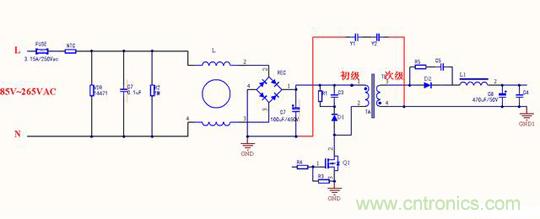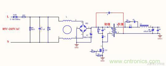 我們都知道Y電容是安規(guī)電容,是跨接L線地以及N線與地之間的電容,它的作用是抑制共模干擾?,F(xiàn)在一共有三種等級,分別是是Y1, Y2, Y4。由于漏電流不能太大這是安規(guī)要求,漏電流太大人體觸摸用電器會有一種麻麻的感覺,因此一般Y電容容量大小為1nF到4.7nF之間。