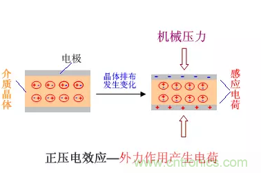 對具有壓電特性的介質(zhì)材料施加機(jī)械壓力,介質(zhì)晶體會發(fā)生結(jié)構(gòu)重組排布,材料表面會感應(yīng)出電荷,產(chǎn)生電位差。