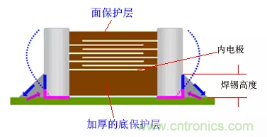 由于保護(hù)層厚度部分是沒有內(nèi)電極的,這部分的BaTiO3陶瓷不會發(fā)生形變,當(dāng)兩端的焊錫高度不超過底保護(hù)層厚度,這時(shí)產(chǎn)生的形變對PCB影響要小,有效地降低噪聲。