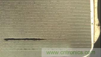 熱沖擊主要發(fā)生在波峰焊時(shí),溫度急劇變化,導(dǎo)致電容內(nèi)部電極間出現(xiàn)裂縫,一般需要通過測(cè)量發(fā)現(xiàn),研磨后觀察,通常是較小的裂縫,需要借助放大鏡確認(rèn),少數(shù)情況下會(huì)出現(xiàn)肉眼可見的裂縫。