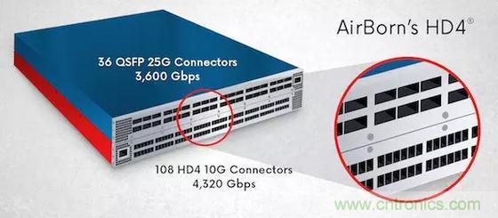 圖12:針對(duì)高密度設(shè)計(jì)的AirBorn 10GHD4®連接器可在同一托架系統(tǒng)內(nèi)提供比25G QSFP連接器更高的吞吐量,從而實(shí)現(xiàn)組件和能源成本節(jié)省。