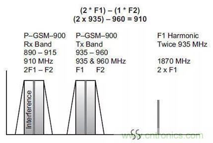 廣泛使用的900 MHz頻段的PIM示例假定兩個GSM載波,一個在935 MHz,另一個在960 MHz。在這種情況下,910 MHz三階產(chǎn)品位于基站接收頻段(圖4)。