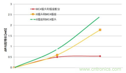 此外,盡管有些連接器在與MC4互插后電阻增加不明顯,但這同樣不能保證互插連接器在經(jīng)過(guò)幾個(gè)月甚至幾年之后電阻的穩(wěn)定性。這也就是大部分不同廠家的連接器在互插并使用一段時(shí)間后才發(fā)生問題的原因。