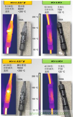 而與之形成鮮明對(duì)比的是MC4自身公母頭插合后的測(cè)試結(jié)果:除了溫度有初始的90℃升高到135℃及功率損失由69W升高到73W外,外觀并無(wú)明顯的變化。