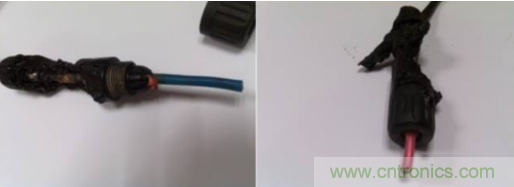 而在失效的樣品中就有兩個(gè)是用了不同的電纜,且外徑相差懸殊。圖11 中的左側(cè)圖連接器一側(cè)用的是光伏電纜(黑色),外徑為6mm,而另一側(cè)則是用的 普通線纜(藍(lán)色),外徑僅為4mm。將藍(lán)色電纜端的螺帽擰開后發(fā)現(xiàn)可能由于密封不夠竟采用了紅色塑料片填充。在該種情況下連接器是很難保證其密封性,因此,在戶外應(yīng)用時(shí)有可能會(huì)進(jìn)水進(jìn)塵,從而破壞絕緣性能,進(jìn)而引發(fā)火災(zāi)。