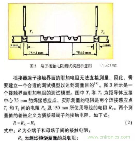 低電平接觸電阻測(cè)量法是使用微型歐姆表測(cè)試導(dǎo)線壓接和端子接觸區(qū)域的電阻。如圖3所示,使用微型歐姆表測(cè)量?jī)蓚€(gè)焊接感應(yīng)點(diǎn)T、T間的電阻和l50mm長(zhǎng)度的所使用導(dǎo)線的電阻,據(jù)此可計(jì)算出所需要的接觸電阻。