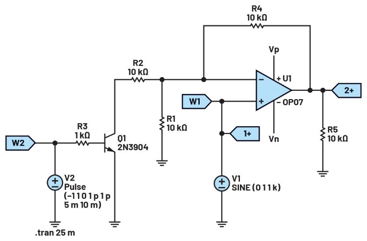 將第一個(gè)波形發(fā)生器用作VIN源,向電路提供幅度為2 V峰峰值的1 kHz正弦波激勵(lì)。使用第二個(gè)波形發(fā)生器控制晶體管,提供幅度為2 V的1 Hz方波激勵(lì)。向運(yùn)算放大器提供±5 V電源電壓。配置示波器,使通道1上顯示輸入信號(hào),通道2上顯示輸出信號(hào)。參見(jiàn)圖3。