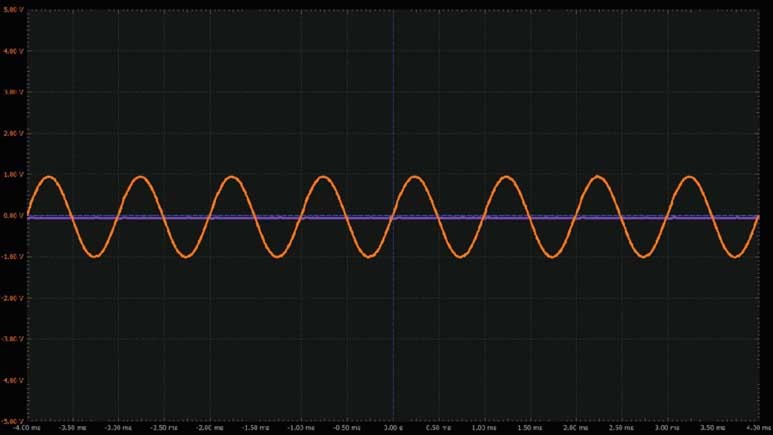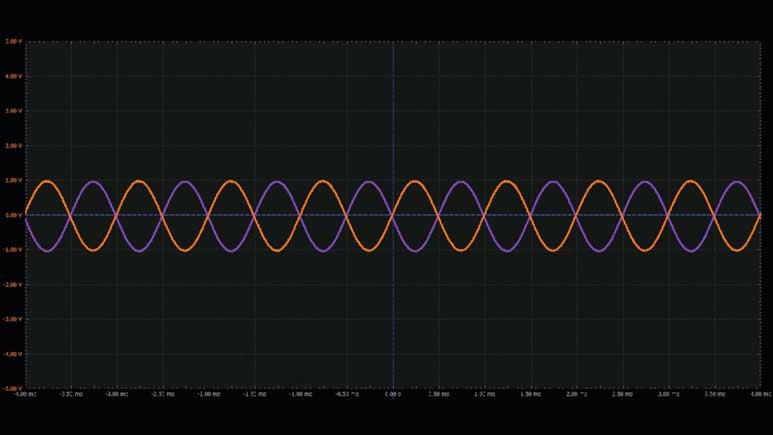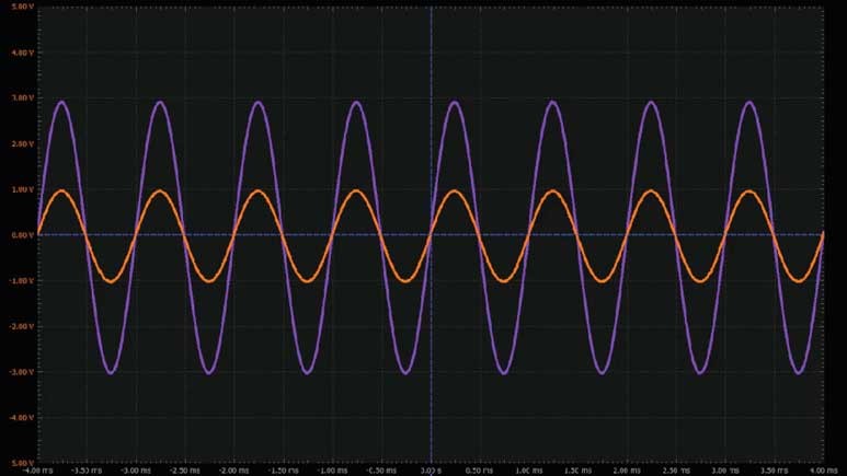 將第一個(gè)波形發(fā)生器用作VIN源,向電路提供幅度為2 V峰峰值的1 kHz正弦波激勵(lì)。向運(yùn)算放大器提供±5 V電源電壓。配置示波器,使通道1上顯示輸入信號(hào),通道2上顯示輸出信號(hào)。參見(jiàn)圖6。