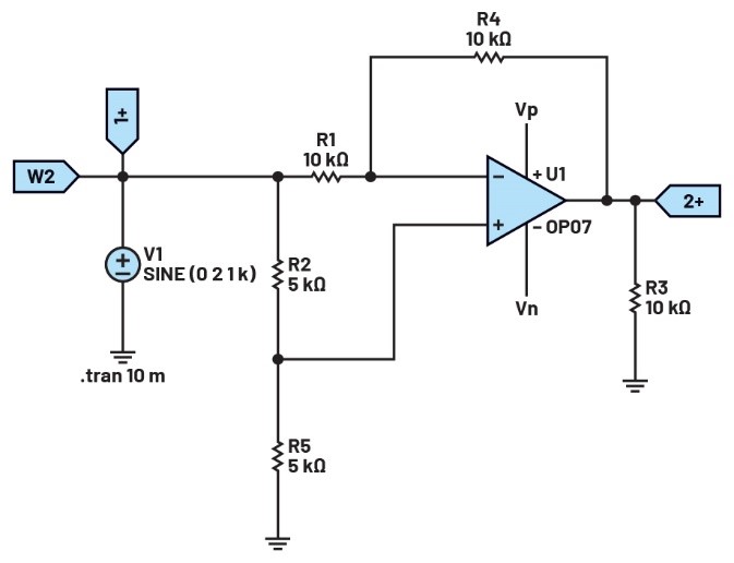 將第一個(gè)波形發(fā)生器用作VIN源,向電路提供幅度為2 V峰峰值的1 kHz正弦波激勵(lì)。向運(yùn)算放大器提供±5 V電源電壓。配置示波器,使通道1上顯示輸入信號(hào),通道2上顯示輸出信號(hào)。參見(jiàn)圖9。