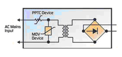 金屬氧化物壓敏變阻器具有高的通流和能量吸收能力,快的響應(yīng)速度,低廉的成本,非常適合在電源端進(jìn)行過(guò)壓保護(hù)。PPTC過(guò)流保護(hù)器件的額定工作電壓也是交流240V,允許最高達(dá)265V的間歇性電壓,可以與交流電源輸入線路中的壓敏變阻器安裝在一起。