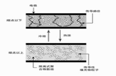 PPTC電路保護(hù)組件是以特殊塑料及傳導(dǎo)性粒子混合而成的傳導(dǎo)式聚合物,如圖1所示。在常溫下,該傳導(dǎo)性粒子會(huì)在聚合物中形成低阻值鏈路,當(dāng)溫度上升超過(guò)該組件的切換溫度時(shí),聚合物中的微晶粒就會(huì)熔化,變成非結(jié)晶狀。當(dāng)微晶粒階段熔化期間數(shù)量增加時(shí),會(huì)使傳導(dǎo)性粒子分離,導(dǎo)致該組件內(nèi)阻抗呈非線性增加。產(chǎn)生熱的原因是由于周圍環(huán)境或電池溫度上升所致,也可能受到過(guò)電流狀態(tài)下阻抗加熱引起,或是因前述不當(dāng)?shù)某潆姰a(chǎn)生。