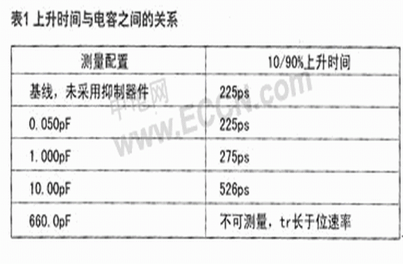 通常,USB 2.0支持480Mbps(bits per second)的數(shù)據(jù)傳輸;DVI和HDMI協(xié)議更是分別支持高達(dá)8Gbps和5Gbps的數(shù)據(jù)傳輸帶寬。在USB2.0、DVI和HDMI的高速數(shù)據(jù)率下,傳統(tǒng)保護(hù)裝置的寄生電容可能破壞信號的完整性或令其失真。失真表現(xiàn)為由較慢的上升和下降時間所致的高態(tài)/低態(tài)瞬變的前沿和后沿被修圓。上升和下降時間較慢會給系統(tǒng)帶來一些問題,其中最重要的是時序問題。電路在特定的時間需要穩(wěn)定的"高"態(tài)和"低"態(tài)。隨著各狀態(tài)之間過渡時間的增加,電路有可能檢測到不完整的過渡期,從而將數(shù)據(jù)誤差引入系統(tǒng)。附表1是不同寄生電容ESD抑制器件對數(shù)據(jù)上升沿時間(10%至90%高電平)所造成的影響比較。
