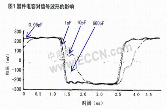 傳輸速率為12Mbps時,其保持電平的時間要長得多(80ns)。在此數(shù)據(jù)傳輸率條件下,10pF或更小的電容值將使得數(shù)據(jù)通過時的失真最小。當(dāng)傳輸速率提高到480Mbps時,信號具有短得多的電平保持時間(2.0ns)。此時10pF電容的ESD抑制器件已經(jīng)引起波形失真:它減少了電平保持時間并使前沿和后沿的形狀大為改變。而660 pF電容的ESD抑制器件則造成了相當(dāng)大的失真,以致于波形甚至無法達(dá)到信號工作電壓。圖1顯示了不同ESD抑制器件對480Mbps數(shù)據(jù)波形的影響。